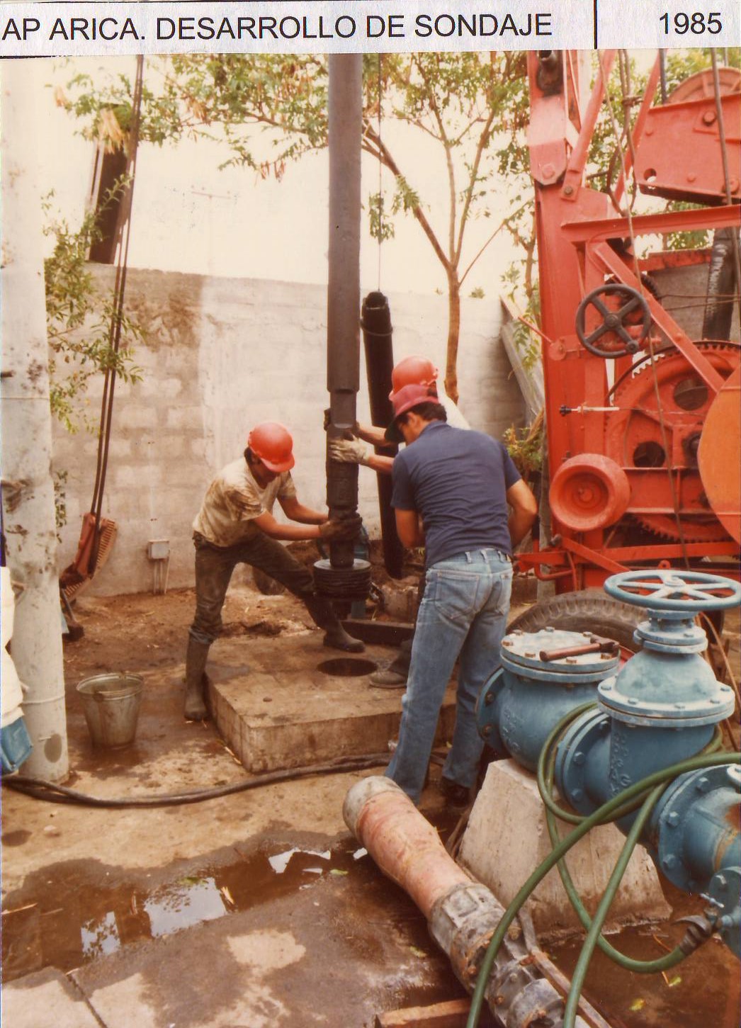 En la Fotografía se aprecia trabajadores en el centro, desarrollando el sondaje para la instalación de Agua Potable en la Ciudad de Arica, Región de Arica y Parinacota.